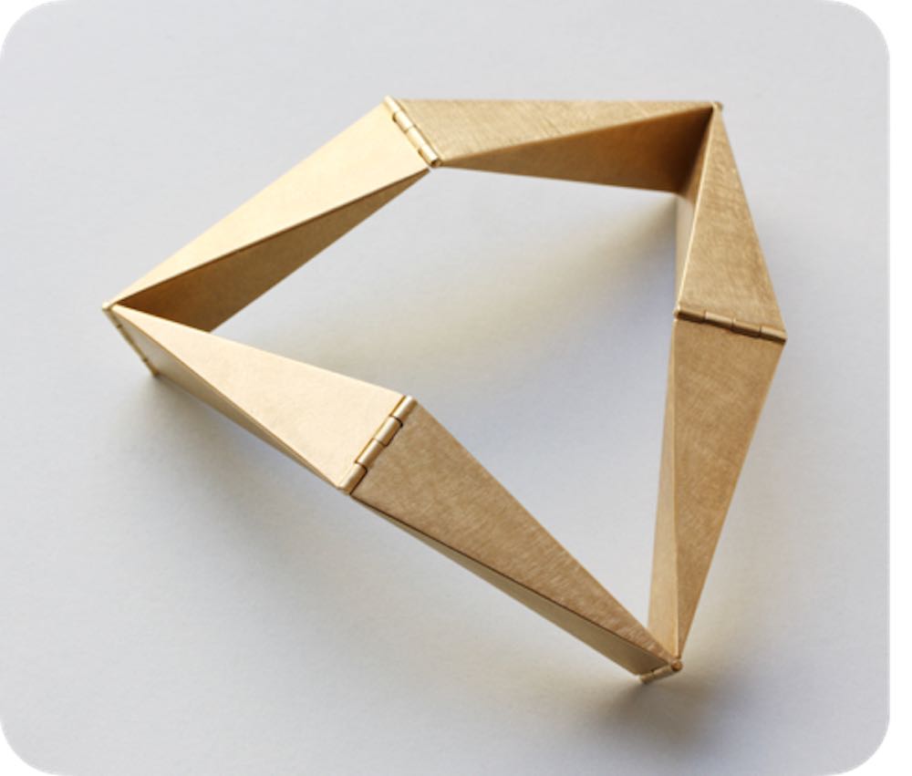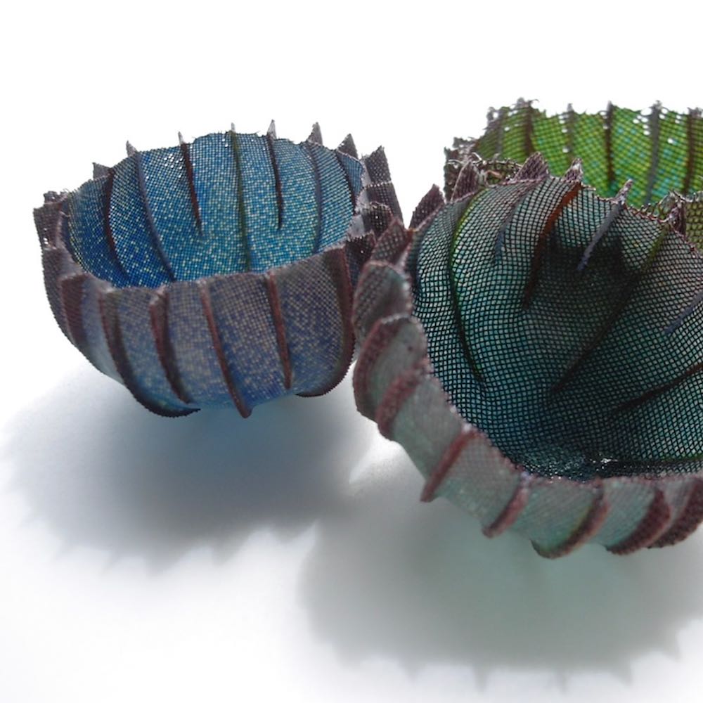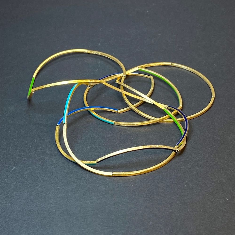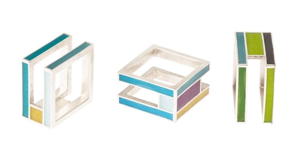 Die hier gezeigten Arbeiten besitzen neben ihrer formalen Ausdrucksweise eine gewisse Leichtigkeit. Man möchte sie anfassen und tragen. Akzente in Gold, Silber oder Platin untermalen die Wertigkeit. Ob über Emaille oder geschmolzene Kunststoffe: Der Hauch an Farbe lockert die Stücke auf.