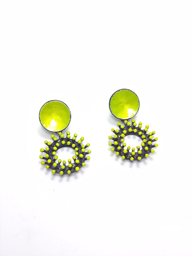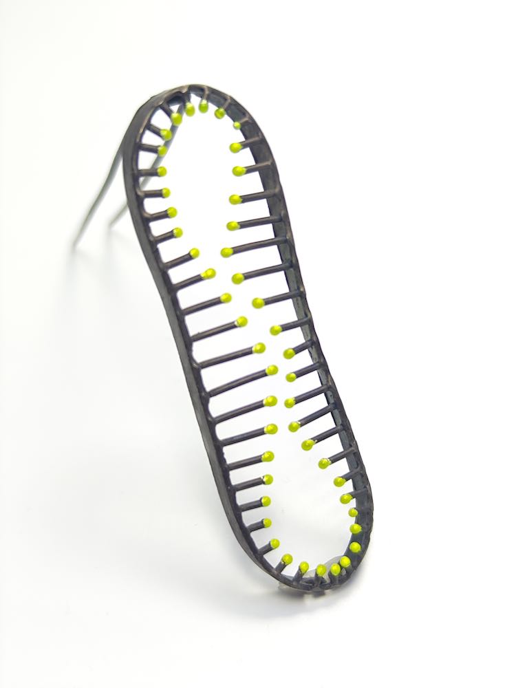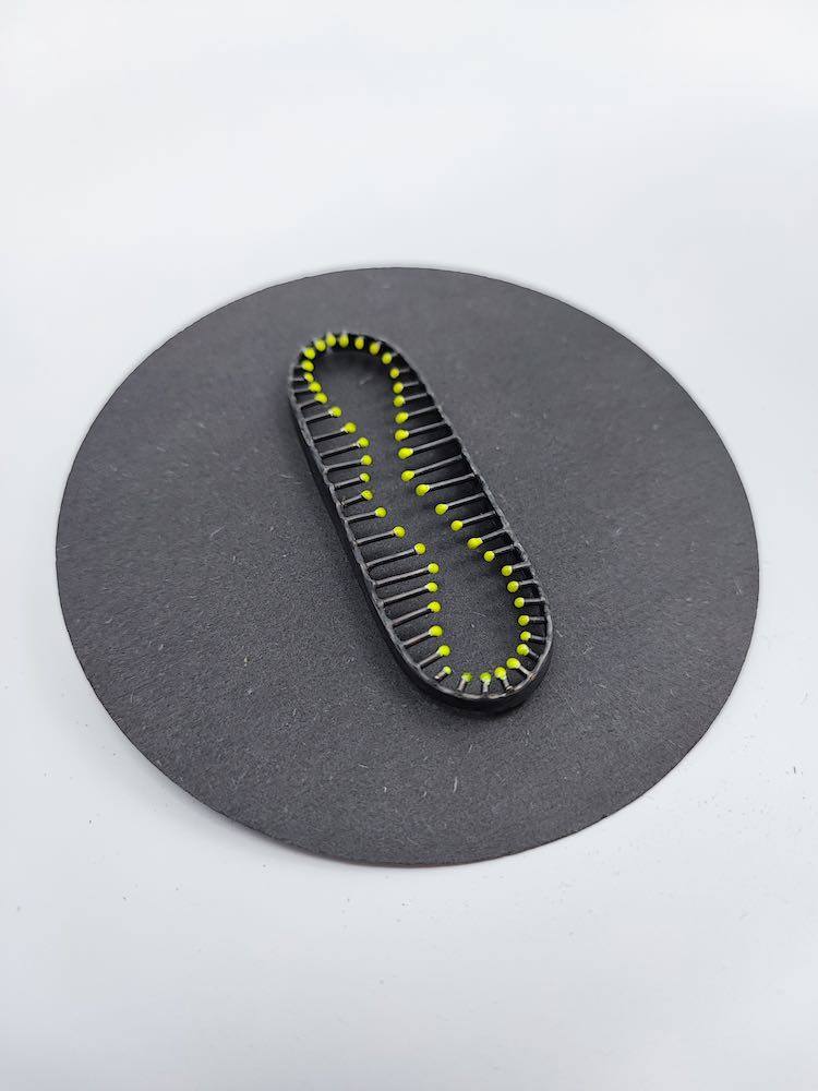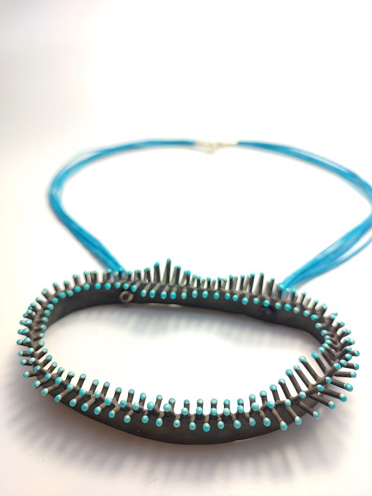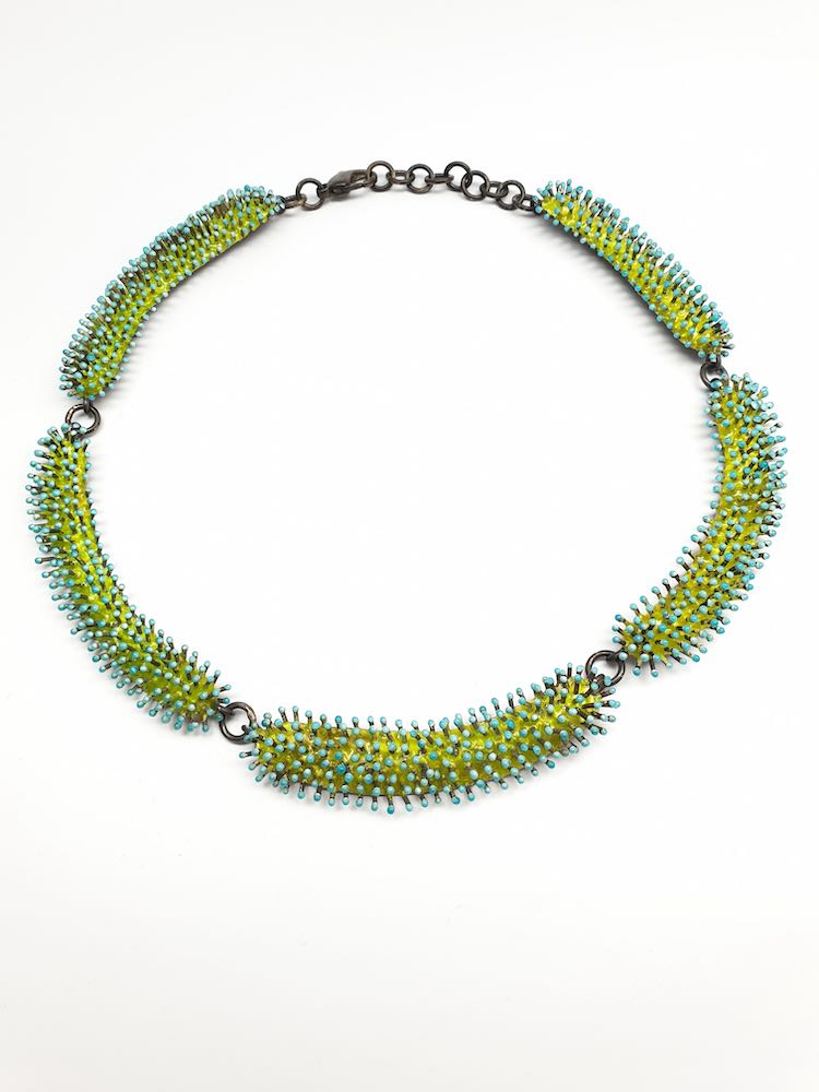 Um die Farbigkeit der Unterwasserwelt zu erreichen, nahm sie an einer Fortbildung für das Emaillieren teil. Jeder „Stachel“ wird in Feinstarbeit mit Emaillepulver belegt und dann bei ca. 900 C gebrannt.