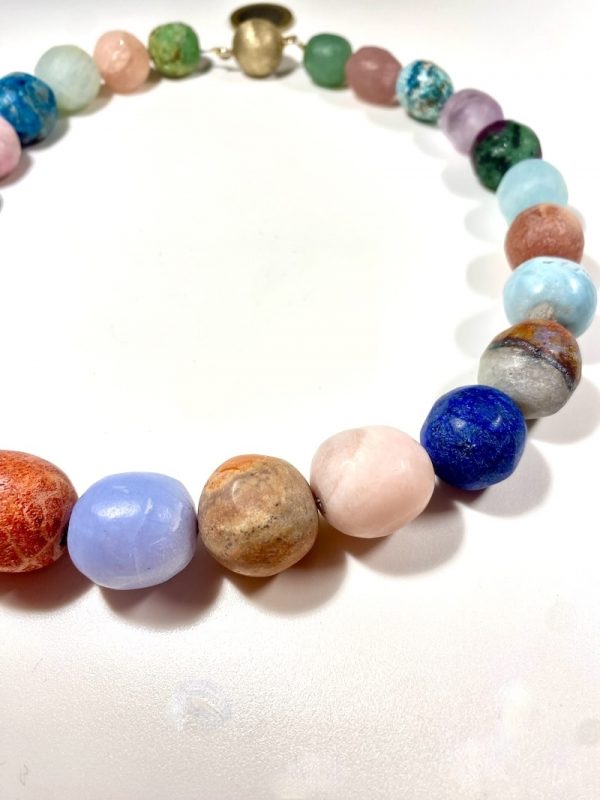 Natürlich bunt, leicht unrund, handbearbeitet aus vielzähligen Edelsteinen und handgeschliffen. Es mag zufällig erscheinen, wie sie angeordnet sind, das ist es aber nicht. Der Steinschleifer, der diesen Halsschmuck gefertigt hat, ist schon sein Jahrzehnten in diesem Gewerbe tätig, er vermag schöne Kompositionen zu schaffen.
