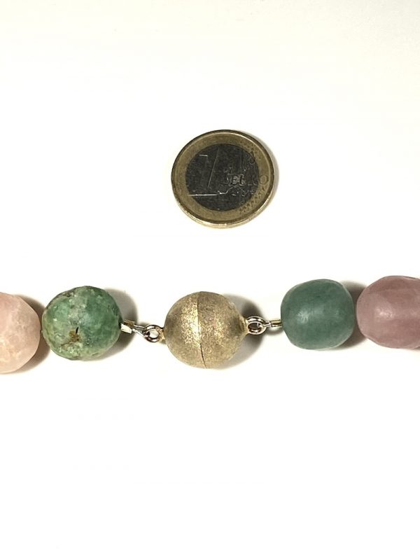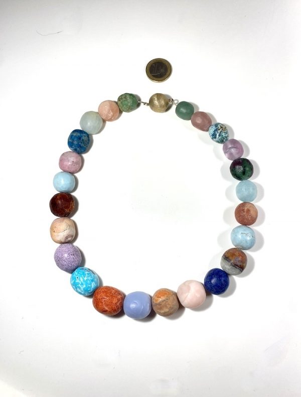 Natürlich bunt, leicht unrund, handbearbeitet aus vielzähligen Edelsteinen und handgeschliffen. Es mag zufällig erscheinen, wie sie angeordnet sind, das ist es aber nicht. Der Steinschleifer, der diesen Halsschmuck gefertigt hat, ist schon sein Jahrzehnten in diesem Gewerbe tätig, er vermag schöne Kompositionen zu schaffen.