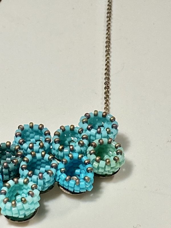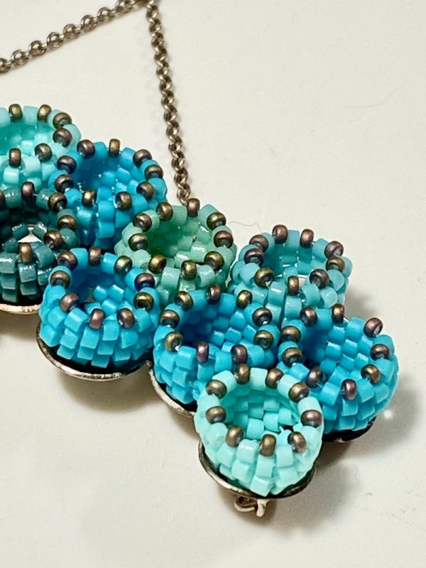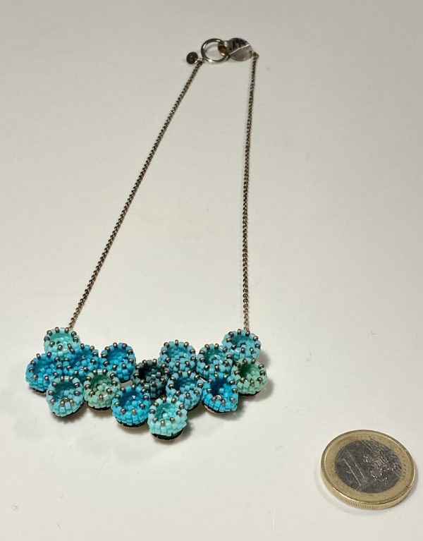 Zart und sehr geduldig wurden hier Japanische Glasperlen miteinander so verwoben, dass dadurch wie kleine Gefässe entstehen, die alle auf einer Silber Platte ruhen und zusammen halten, der Halsschmuck hängt an einer zarten Silber Kette.