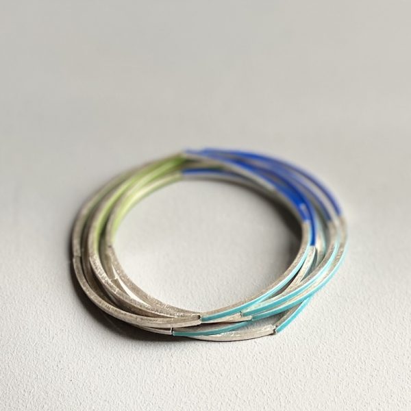 Er besteht aus Silber Röhrchen, mit quadratischem Querschnitt, die sanft gebogen sind, eine elastische Silikon Schnur verbindet die Elemente miteinander.
