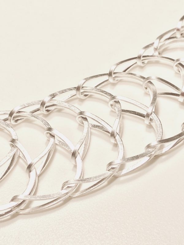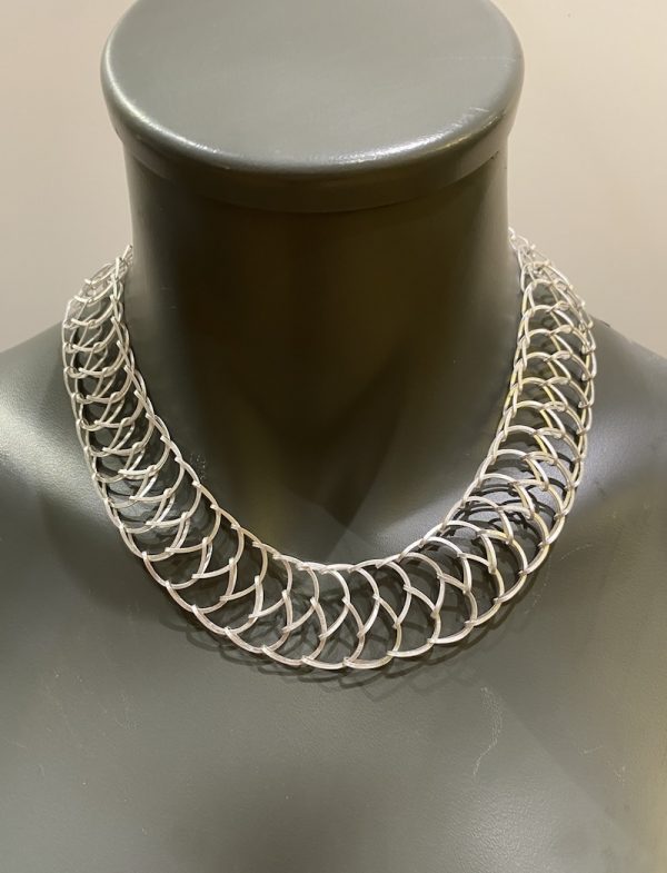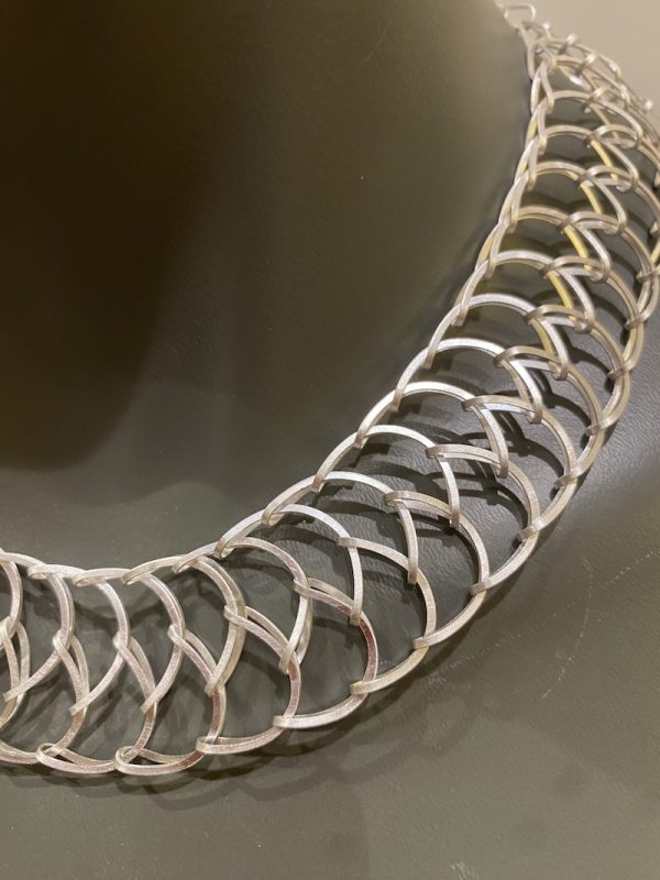 Die zahllosen, gleich großen Ösen sind immer wieder und nacheinander so geklappt, dass ein Geflecht entsteht, dass keine zusätzlichen  Verbindungselemente benötigt, sehr überraschen. Anschliessend ist das Sterling-Silber in Schwefelsäure so hell geworden, die Technik nennt man „Weiss-Sieden“. Der Halsschmuck legt sich sehr schön um den Hals!