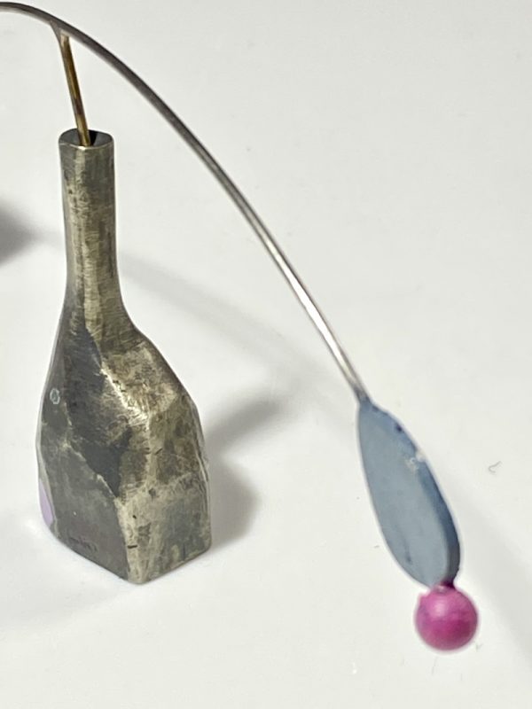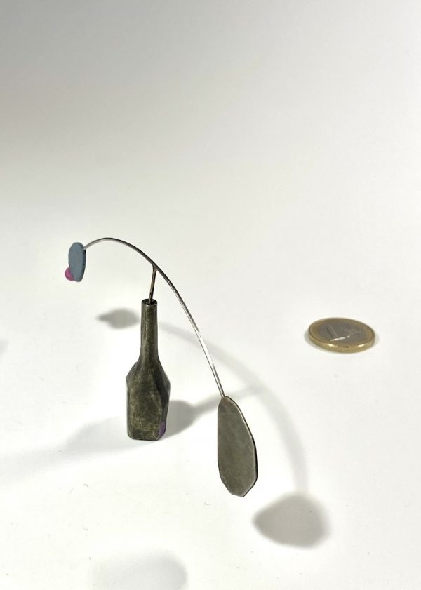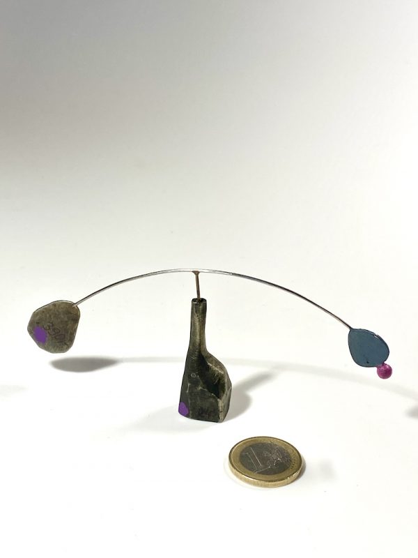 Zum Thema „Balance und Gleichgewicht“ sind diese kleinen Kunstwerke in Japan entstanden, sanft und langsam pendelt das obere Teil, auch schon von Luftzügen, fast meditativ. Diese Arbeiten ergänzen sich sehr schön, wenn man mindesten zwei davon neben einander stellt. Aus Neusilber gefertigt und knapp 8cm groß.