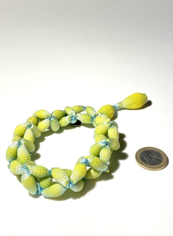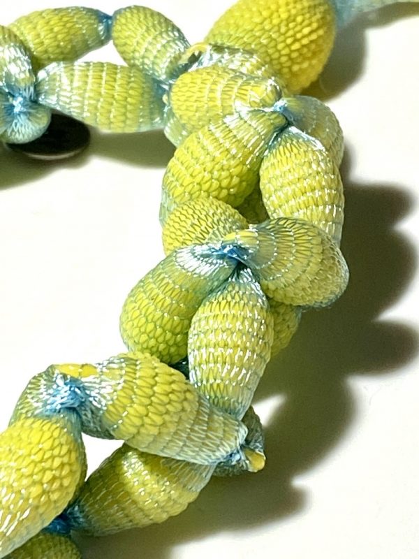Bei diesem Schmuck, wurde ein textiler Schlauch mit Silikon gefüllt, so scheint das gelbe Silikon durch den grünen Schlauch, der zu einem Armband verflochten ist. Der französische Designer hat bei dieser Technik eine hohe Fertigkeit entwickelt