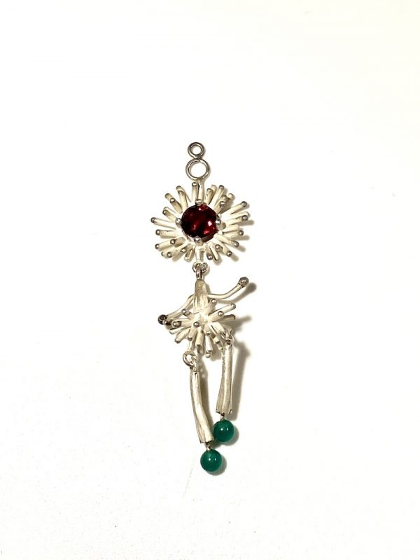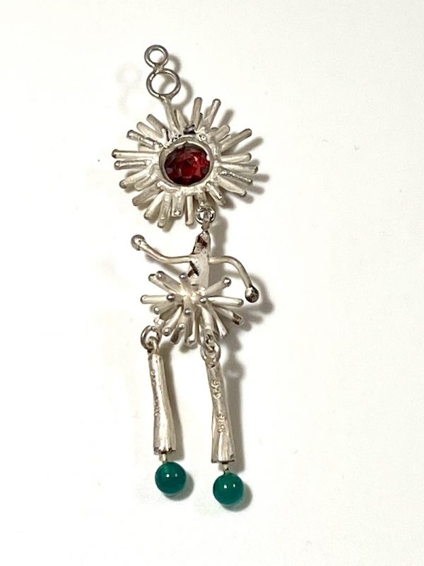 Zu einer Gruppen Ausstellung mit dem Namen: Kopf -Bauch-Füsse entstand die hübsche Tänzerin, als Anhänger entworfen, kann es auch eien einzelner Ohrschmuck sein. Die einzelnen Glieder sind mit Ösen verbunden, daher ist es sehr beweglich, Das Verarbeitete Silber hält am Kopf einen Granat, die Füsse bilden zwei Smaragde.