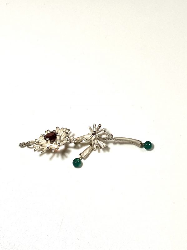 Zu einer Gruppen Ausstellung mit dem Namen: Kopf -Bauch-Füsse entstand die hübsche Tänzerin, als Anhänger entworfen, kann es auch eien einzelner Ohrschmuck sein. Die einzelnen Glieder sind mit Ösen verbunden, daher ist es sehr beweglich, Das Verarbeitete Silber hält am Kopf einen Granat, die Füsse bilden zwei Smaragde.
